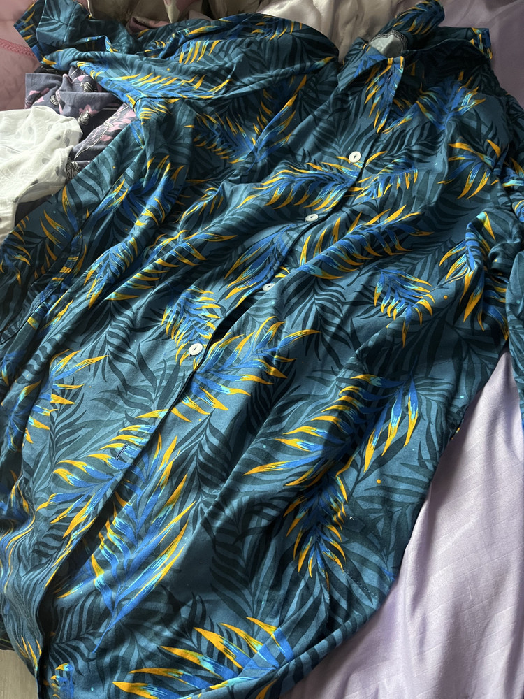 Халат хороший, из плотного трикотажа, не на жару. Но по цвету на фото он больше сине-зеленый, а по факту ярко-синий.